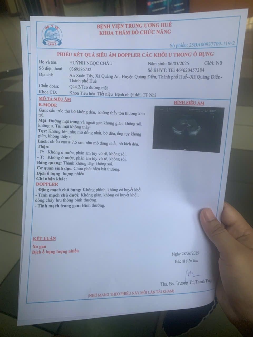 Bé Huỳnh Ngọc Châu sinh 6/3/2025 hiện tại đang bị xơ gan nặng, lách lớn, viêm phổi, lượng dịch trong ổ bụng nhiều. Trước đó có phẫu thuật Kasai nhưng do sơ gan nặng bây giờ phải phẩu thuật sớm để đường mật thoát do bị teo. Kinh phí phẫu thuật là 500 triệu để ghép gan sớm nhất có thể. Theo cháu quan sát thì hiện tại da và mắt của bé Châu đã bị vàng và bé đang điều trị tạm thời tại Khoa Nhi bệnh viện Trung Ương Huế (phòng 205 - tầng 2) có thể bị biến chứng nếu để lâu. Kinh phí điều trị và làm xét nghiệm từ lúc vào viện đến hiện tại đã khoảng 20 triệu.