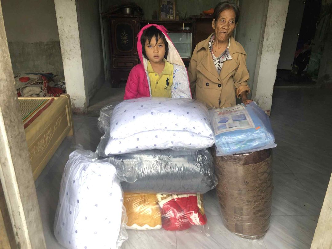 Chị Yến Nguyễn kết nối bà Ngô Thị Vân giúp đỡ phần quà chăn, màn, gối.... cho bà cháu bà Yên