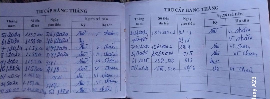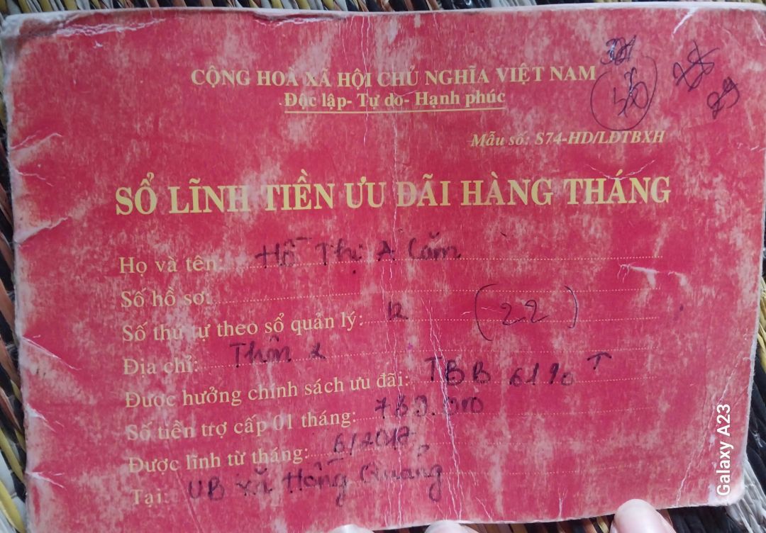 - Bà nội tên là Hồ Thị A Căm (85 tuổi). Trợ cấp xã hội hàng tháng được 500.000 đồng/tháng. Sổ lĩnh tiền ưu đãi hàng tháng được 1.565.000 đồng/tháng. Sổ huân chương/Người có công với cách mạng là 1.639.000 đồng/tháng.