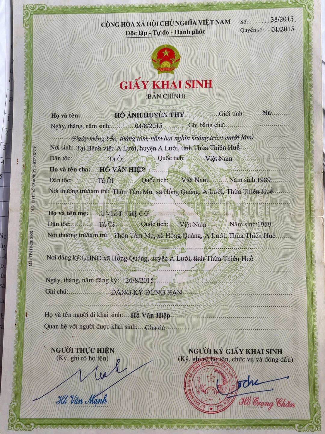 - Bố : Hồ Văn Hiệp (36 tuổi). Làm nương rẫy ăn qua ngày.