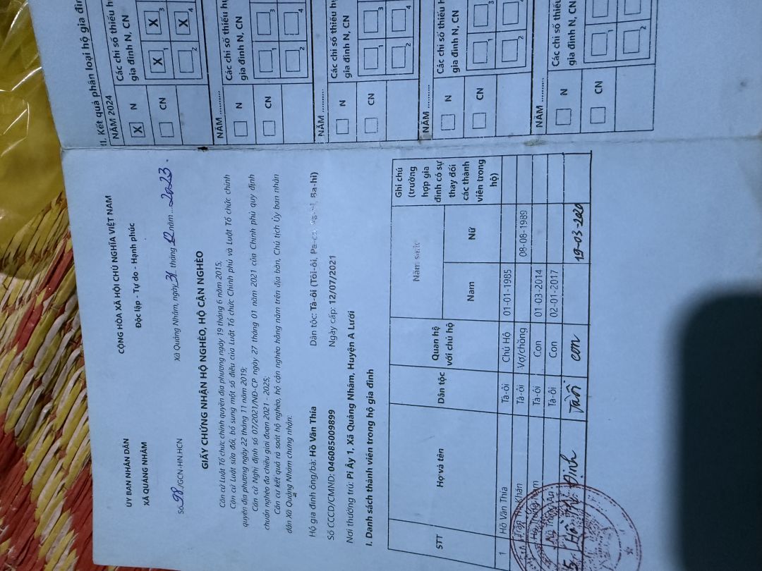 Vợ là chị Hồ Thị khăn (35 tuổi). Không có việc làm ổn định, thường xuyên ốm đau bệnh tật. Hiện đang mang thai được 3 tháng tuổi). Không có thu nhập