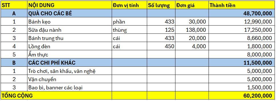 • Nhóm Trò Chơi Văn Nghệ: Tập trung các bé và tổ chức trò chơi, tặng quà, rước đèn Trung Thu