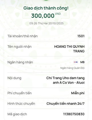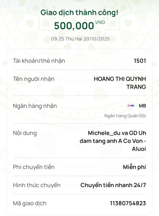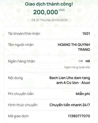 Bạn Tran Thi Phuong Lien ủng hộ cho đám tang của ông 500,000đ, tiền đã chuyển vào tài khoản thủ quỹ rồi ạ.
