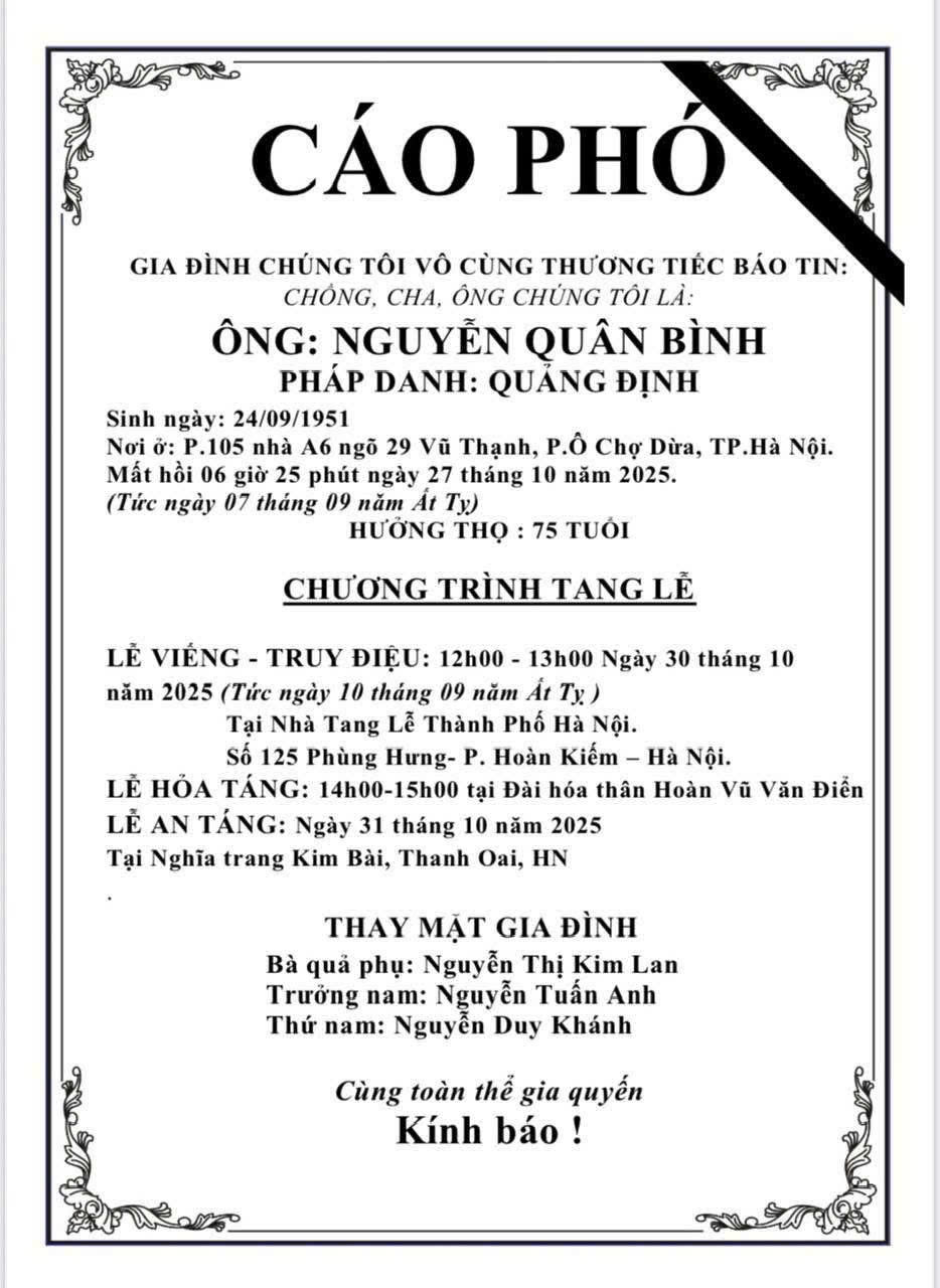 Lễ tang từ 12-13.00 ngày 30/10/2025
