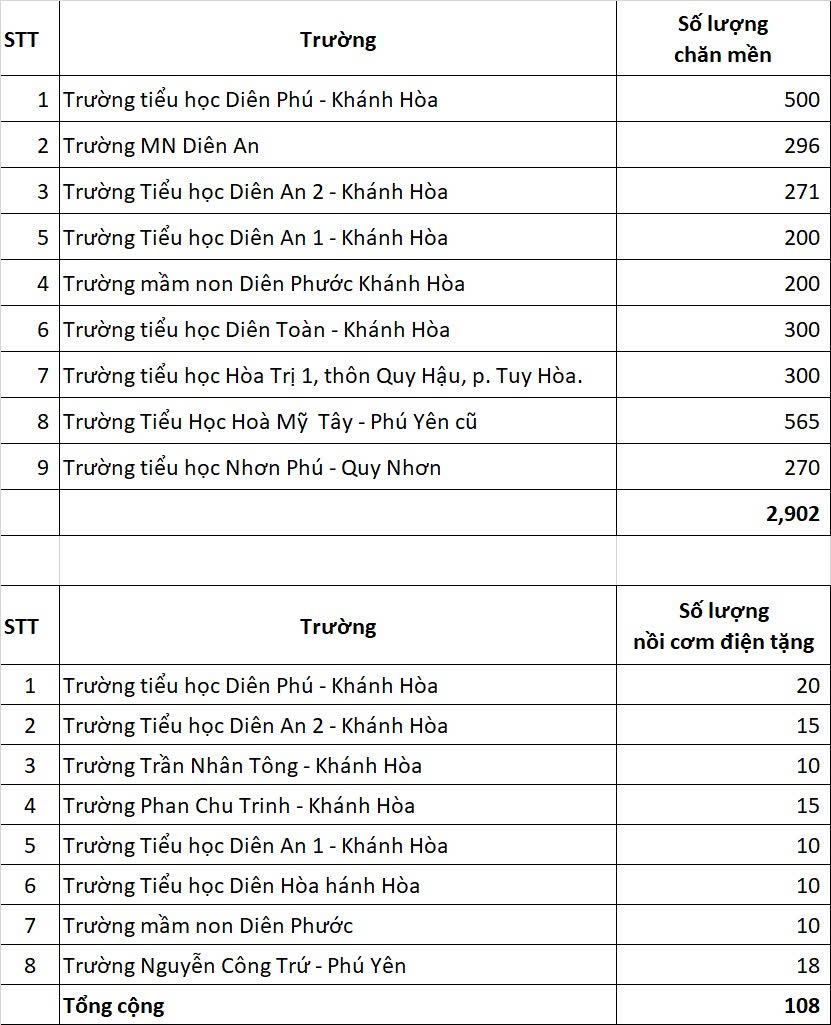Sau khi trao đổi cụ thể với hiệu trường các trường Khánh Hòa, Thocon gửi số lượng chi tiết chăn mền và nồi cơm điện như sau: