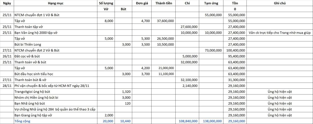 Vit tổng kết chi phí đợt 1 trao tặng Vở & Bút cho 14 trường ở Khánh Hòa và thống kê ủng hộ chương trình đến thời điểm này. Hiện Vịt còn giữ 29.160.000đ của tạm ứng lần 2.