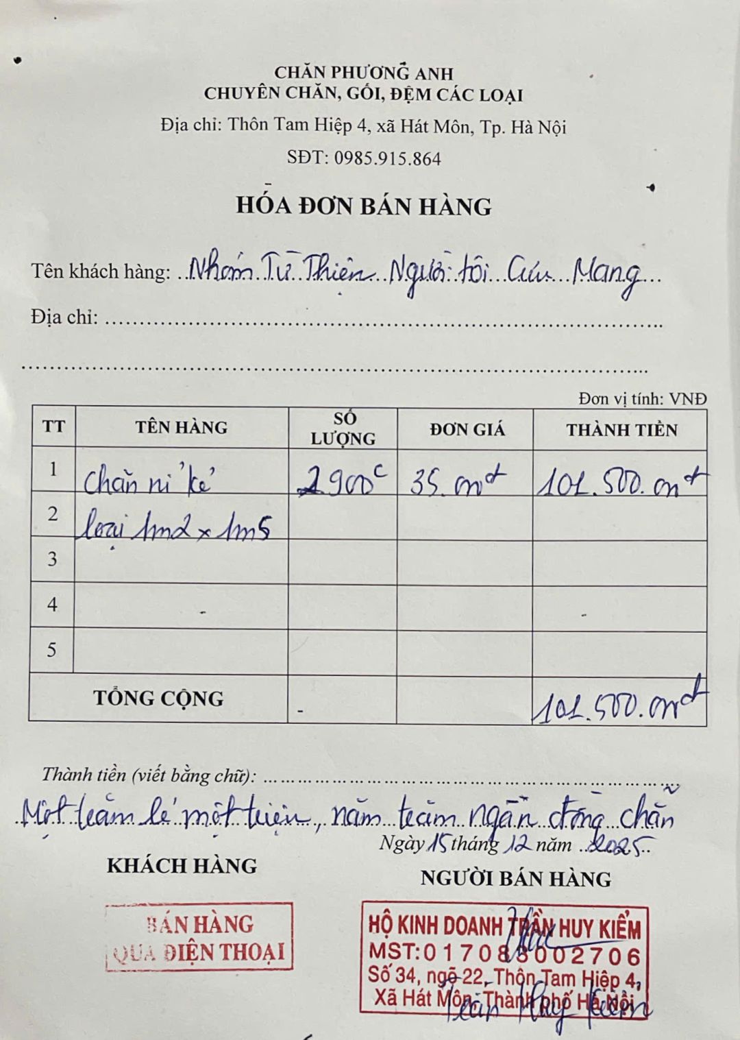 Tổng cộng: 1.371 chăn x 35.000đ = 47.985.000đ