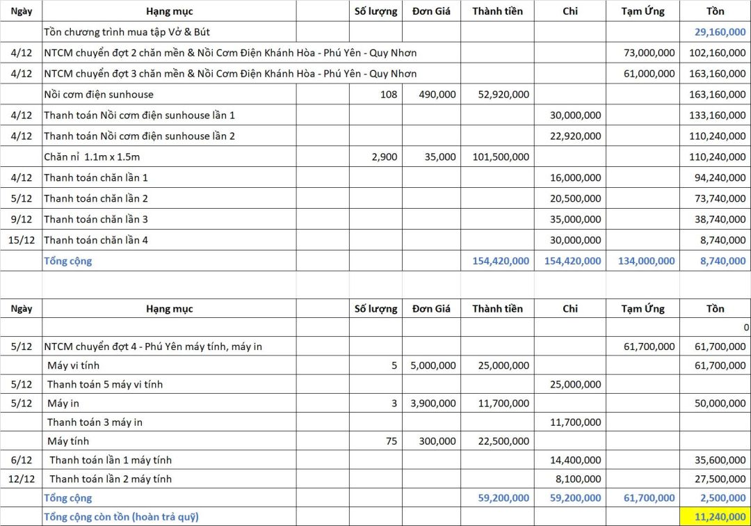 Còn dư: 11. 240.000đ đã chuyển trả vào quỹ