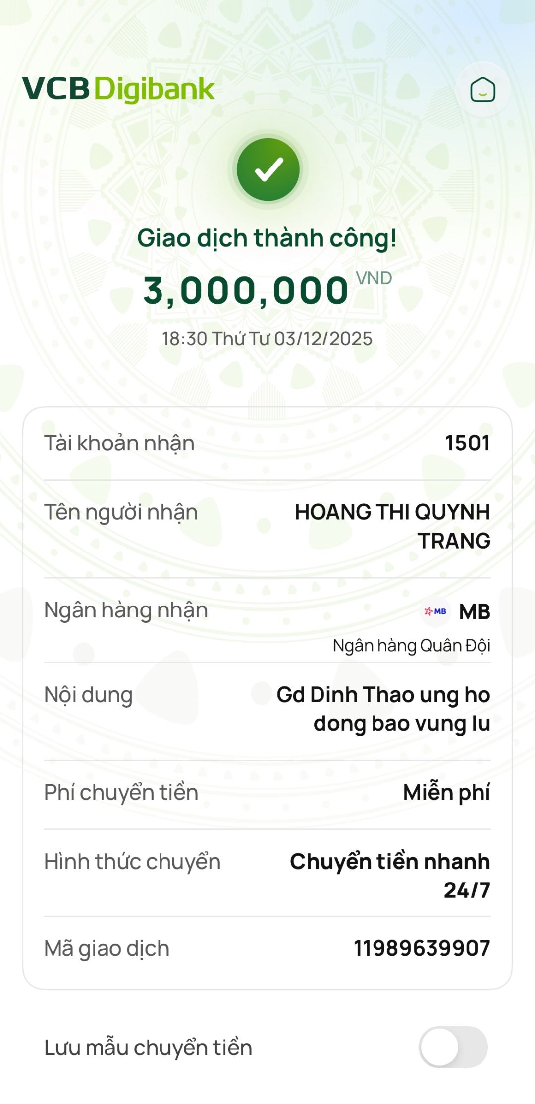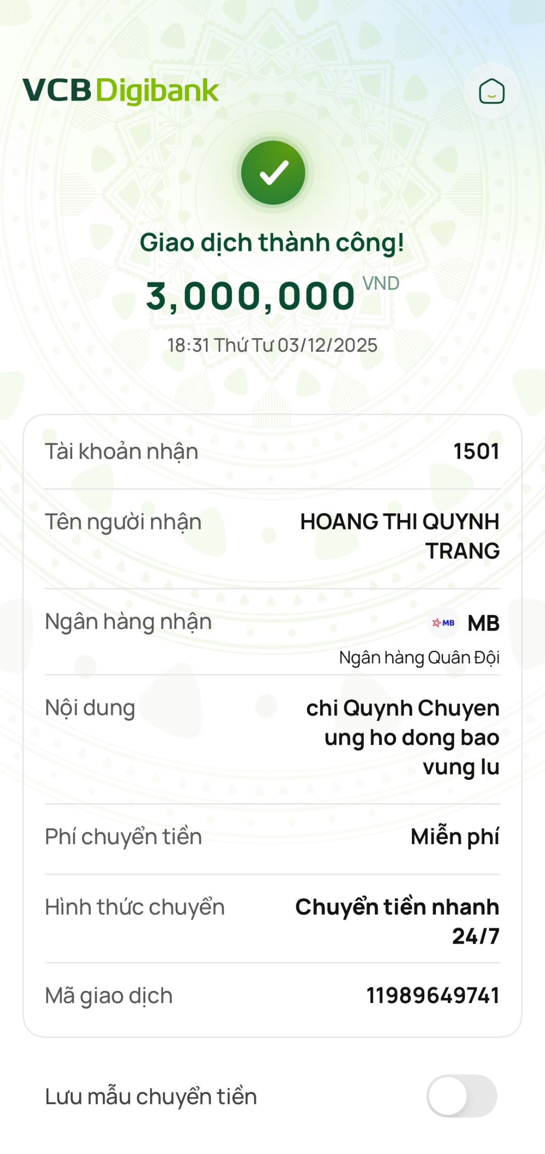 Chị Quỳnh Chuyên ủng hộ 3,000,000đ