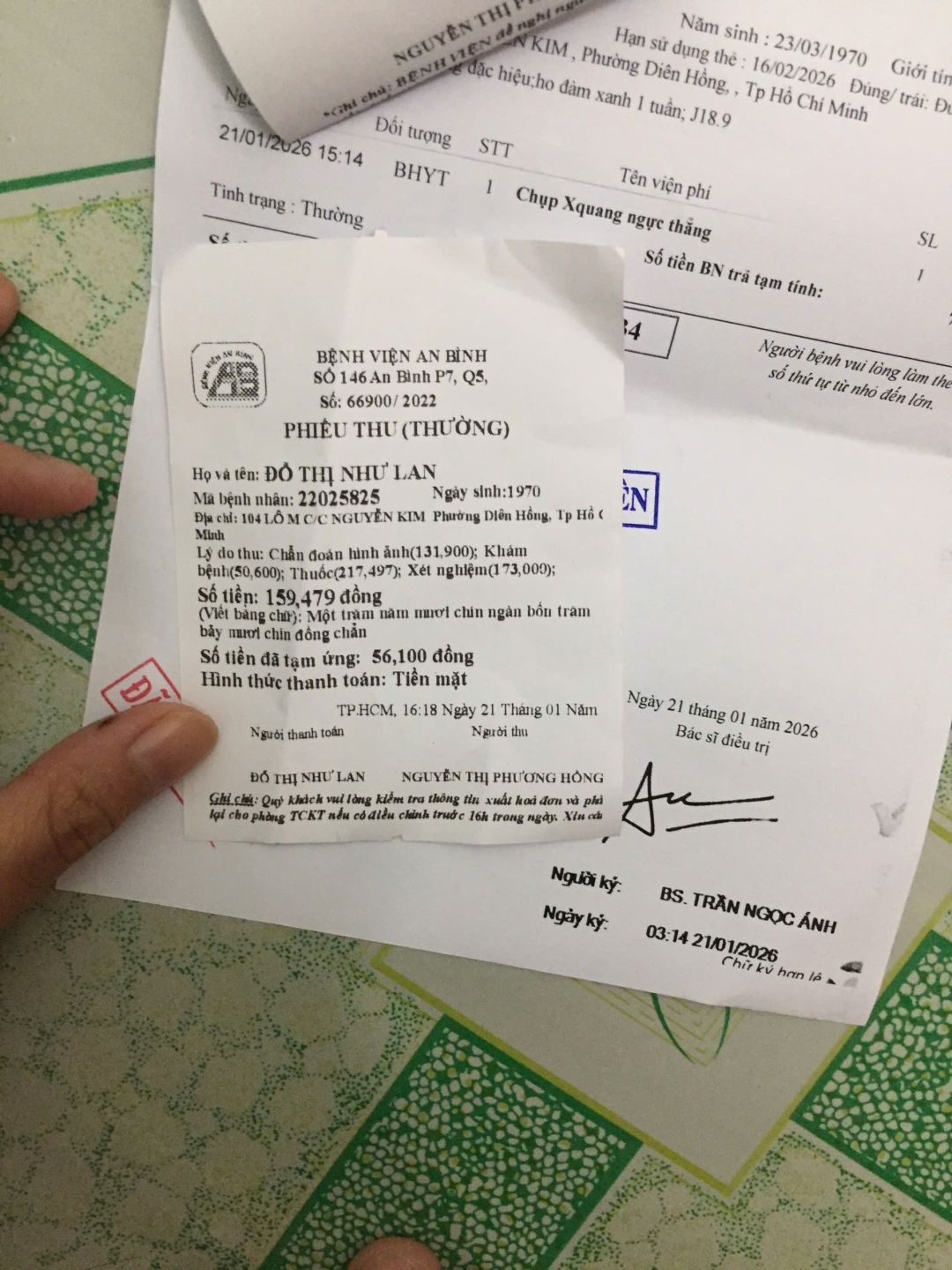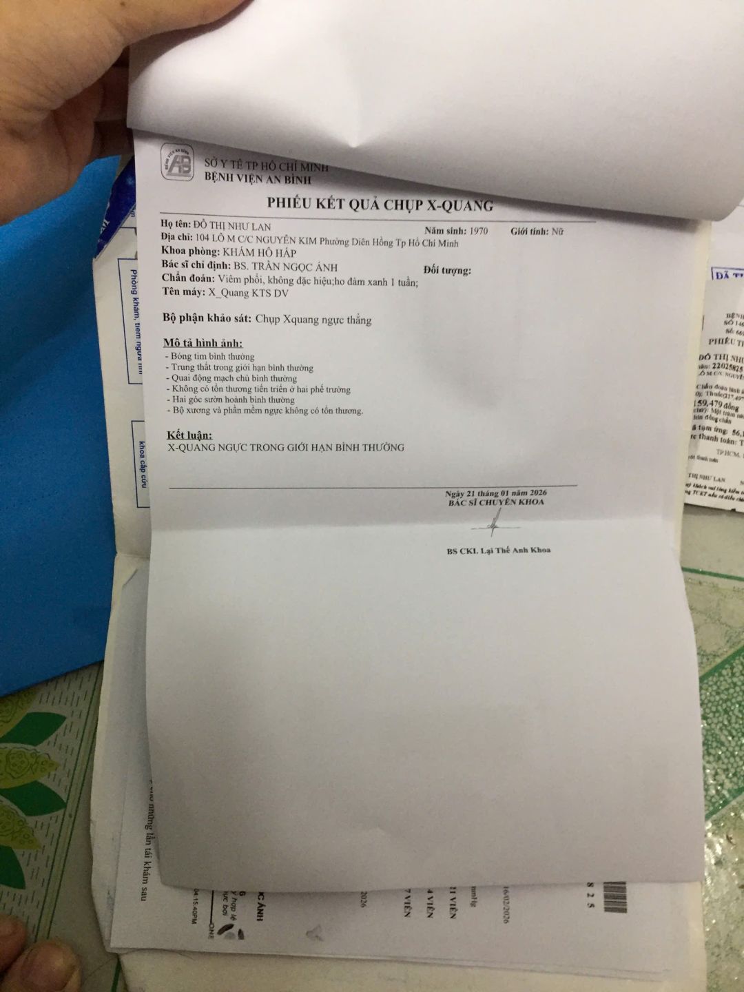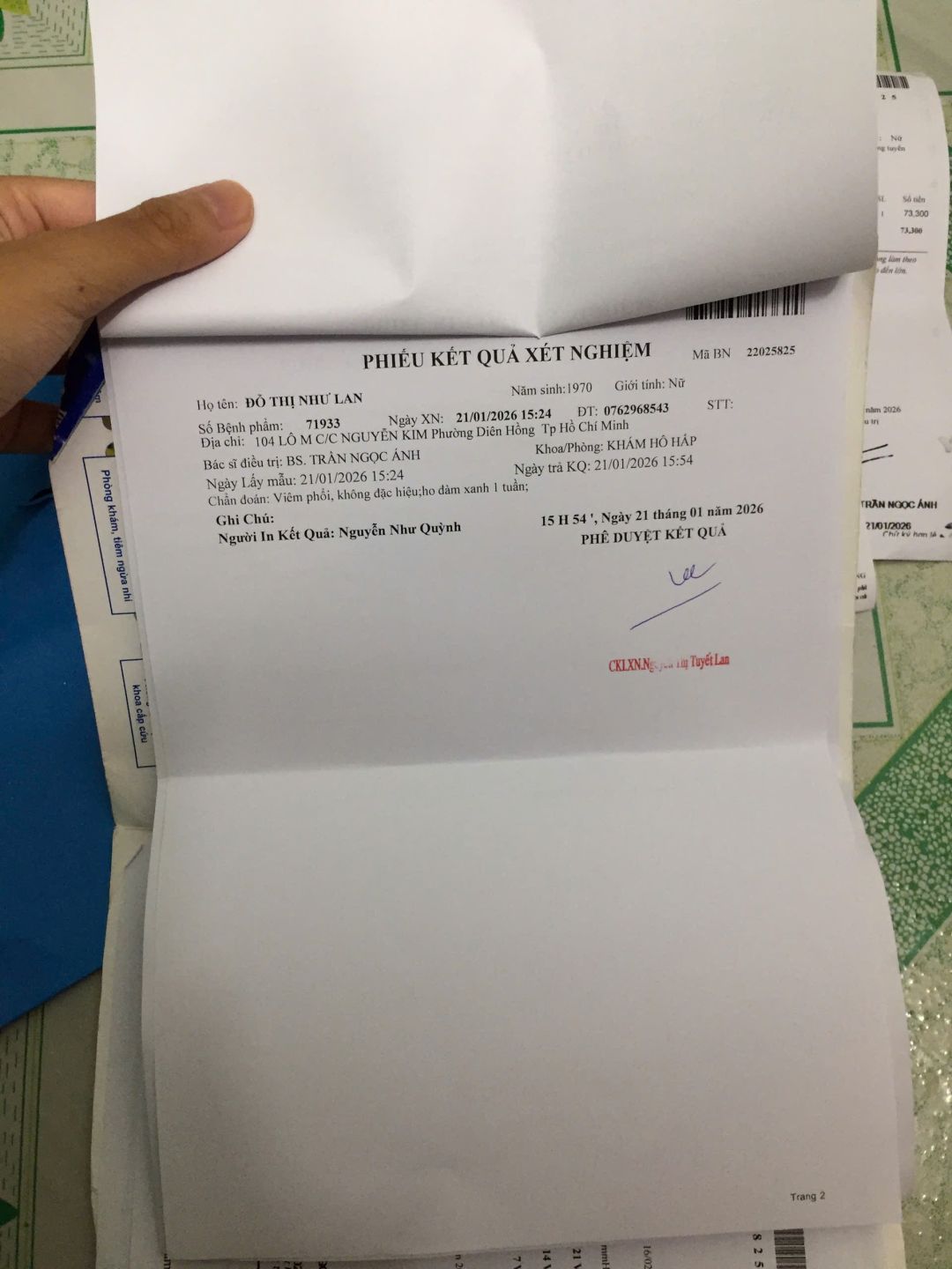 Kết quả chẩn đoán cô bị viêm phổi, tiền khám bệnh, thuốc men & tiền xe đi lại khoảng 400k, số tiền còn lại letuantu có nói cô Lan giữ lại dùng khi cần gấp.