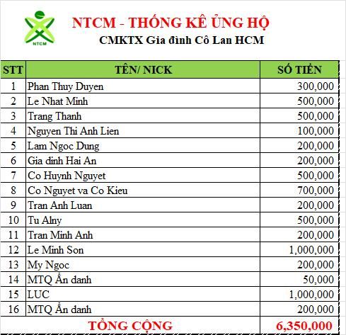 Letuantu đã chuyển 2,000,000đ CMKTX hỗ trợ cho cô đi bệnh viện kiểm tra. Số tiền này được lấy từ tiền chị Lano ủng hộ cho buổi tiệc sinh nhật NTCM tại TPHCM nhưng chưa dùng đến.
