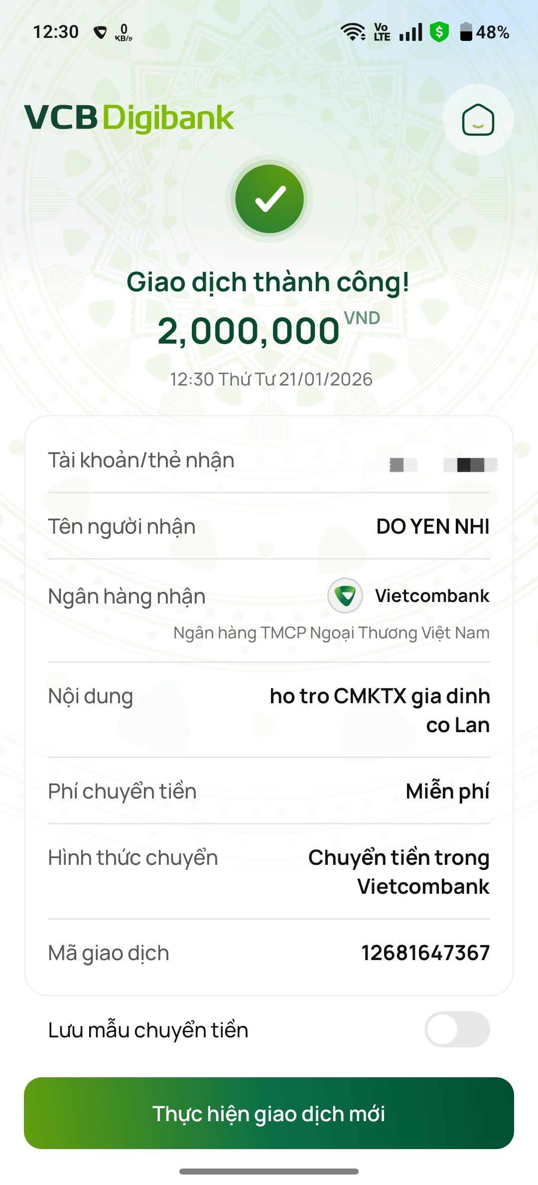 Hôm nay, letuantu đã ứng trước 3,000,000đ để chuyển cho cô.