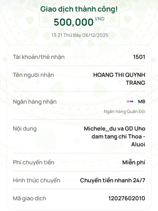 Quỹ có nhận thêm 2 khoản ủng hộ này tổng cộng 500,000đ cho hoàn cảnh của Chị Thoa, nhờ TĐP điều phối chuyển giúp đến gia đình nhé !