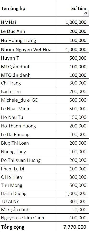 Vịt thống kế số tiền ủng hộ MTTT anh Mieh tới giờ là 7.770.000đ (1 triệu của anh HMHai sẽ chuyển sau). Nhờ anh 6x điều phối giùm nhé.