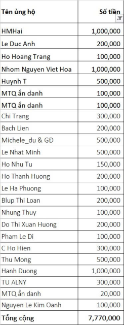 Vịt thống kế số tiền ủng hộ MTTT anh Mieh tới giờ là 7.770.000đ (1 triệu của anh HMHai sẽ chuyển sau). Nhờ anh 6x điều phối giùm nhé.
