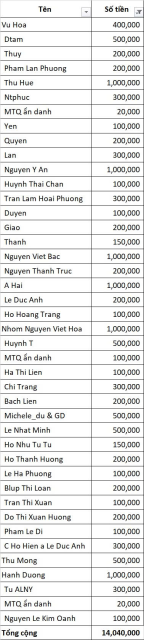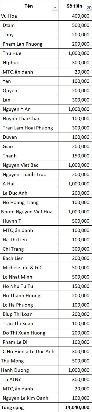 Vịt gửi tổng hợp giúp trường hợp này đến hôm nay, tổng là 14.040.000đ, quỹ đã chuyển 7.770.000đ. Nhờ tổ điều phối chuyển tiếp phần 6.270.000đ cho chị Wendy Duong trao gia đình. Cảm ơn chị.