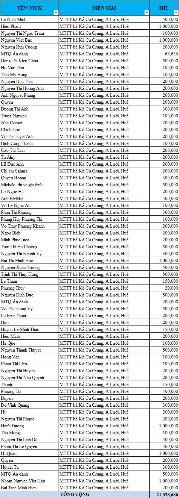 Trân trọng cảm ơn ban điều phối, ban quản trị, các quý MTQ từ nhóm thiện nguyện Người tôi cưu mang( NTCM) và các quý MTQ đã chung tay lo cho a cả hậu sự tử tế và ấm áp với số tiền hỗ trợ gia đình lo mai táng 21.790.000 đ( e Wendy có nhận thêm sự giúp đỡ từ bạn bè 250.000 đ nữa)