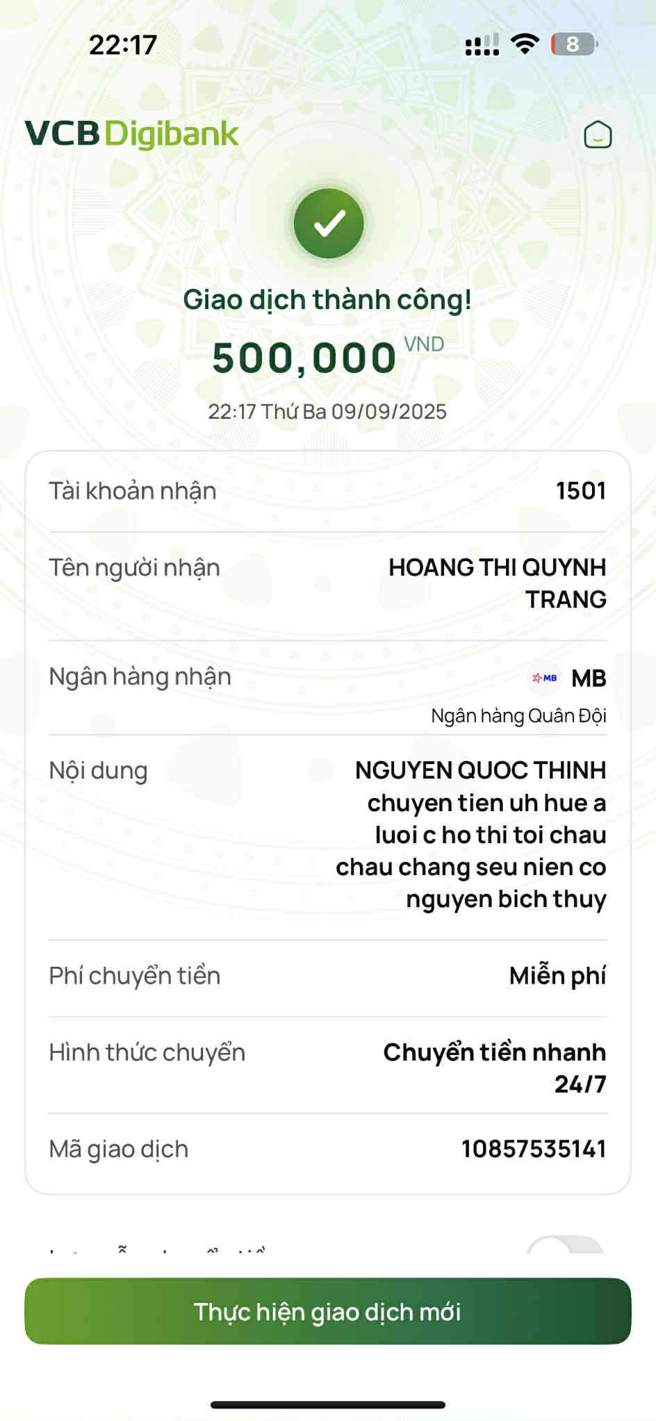 Trích dẫn của: trieuandaikin vào 08-05-2020 12:43:52em có ck 500k chị nha.@trieuandaikin : em ơi , đợt này hình như em ko đứng tên trieuandaikin khi chuyển phải ko? Em cho nội dung khi chuyển để chị xác nhận được chính xác . Cảm ơn em.