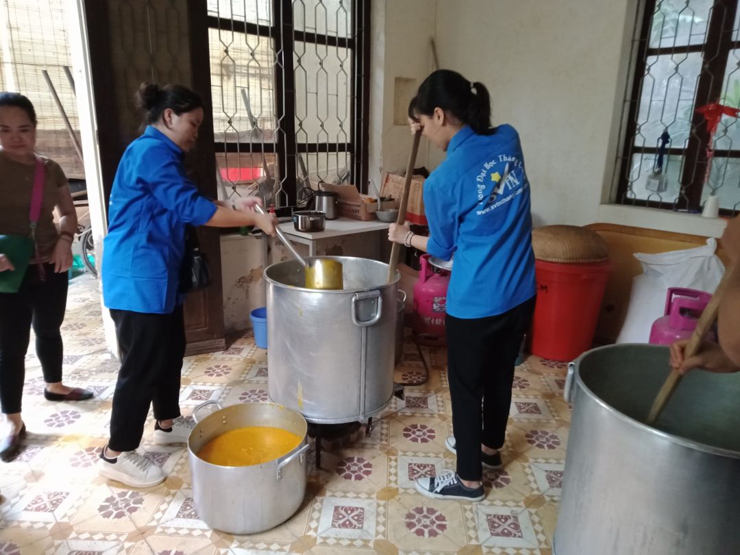 - 15h15: Múc cháo ra 6 nồi nhỏ chờ xe đến chở đi viện.