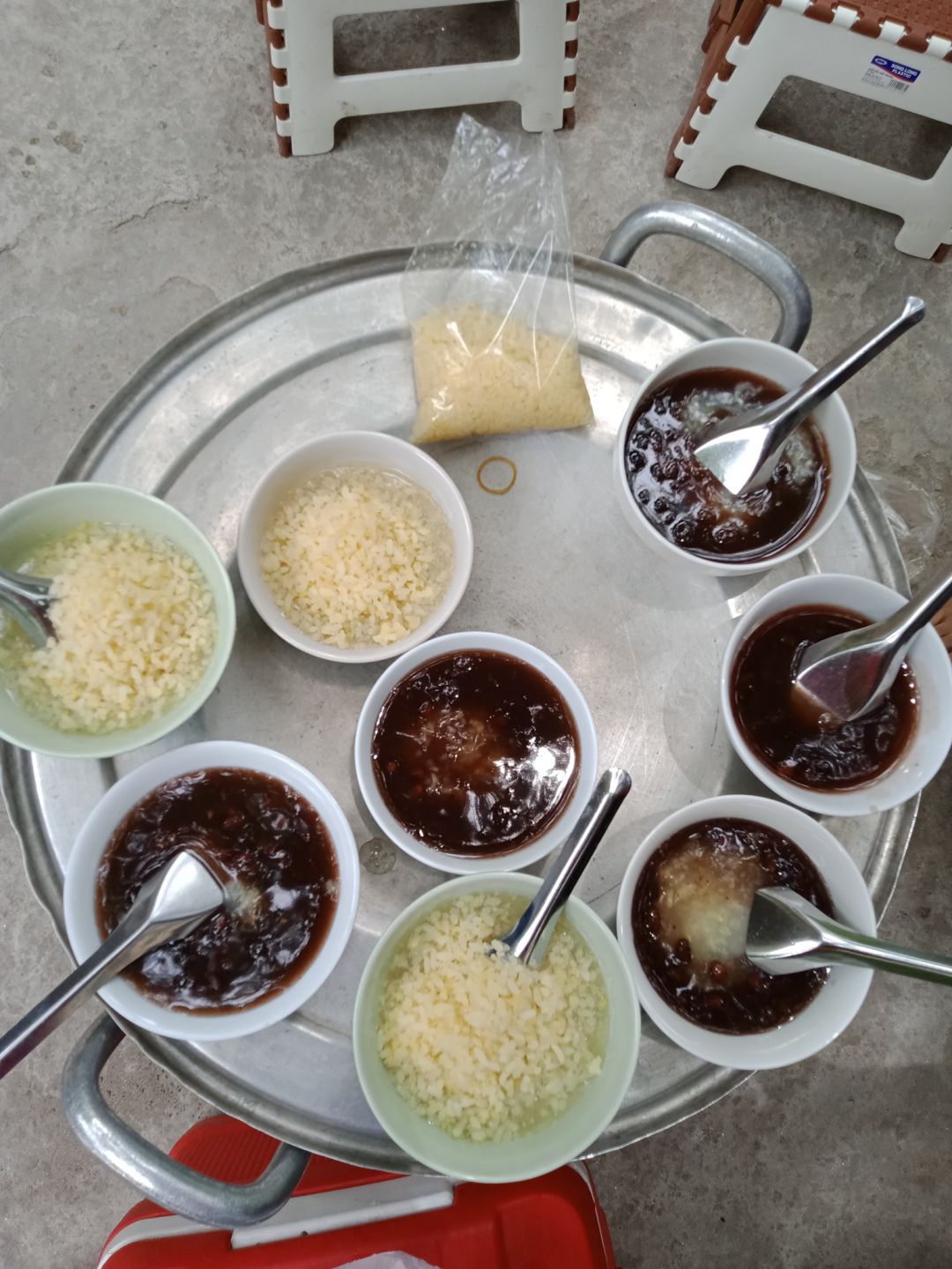 Theo dõi bếp. Nồi nhân rau bí đỏ carrot luộc chín bắc xuống. Nước ở nồi to sôi múc ra tráng 5 nồi nhỏ và đổ 1 phích để tráng nồi đựng nhân. Chia đôi nước vào 2 nồi to đổ thêm nước bằng 1/2 nồi, đun sôi. Nước sôi cho gạo, giảm nhỏ lửa, 10' ngoáy 1 lần đến khi cho nhân.