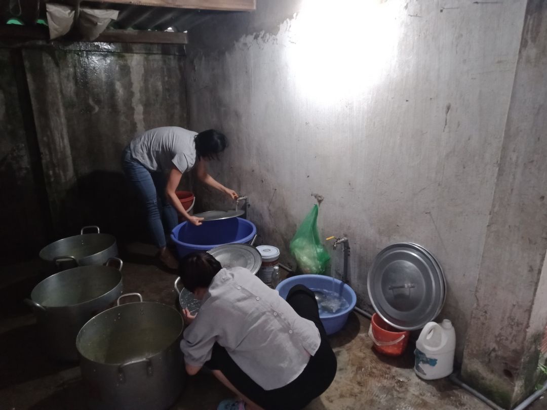 (Rửa lại 2 nồi to, 6 nồi nhỏ, muôi nấu, máy xay, rửa nhân rau. 1 bếp luộc nhân rau bí đỏ carrot, 1 bếp đặt nồi to đổ nước đầy 2/3 đun to lửa. Các công việc hoàn thành khoảng 12h)
