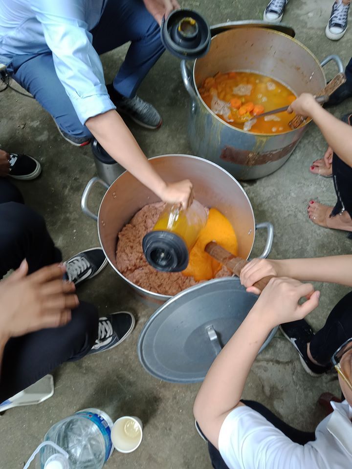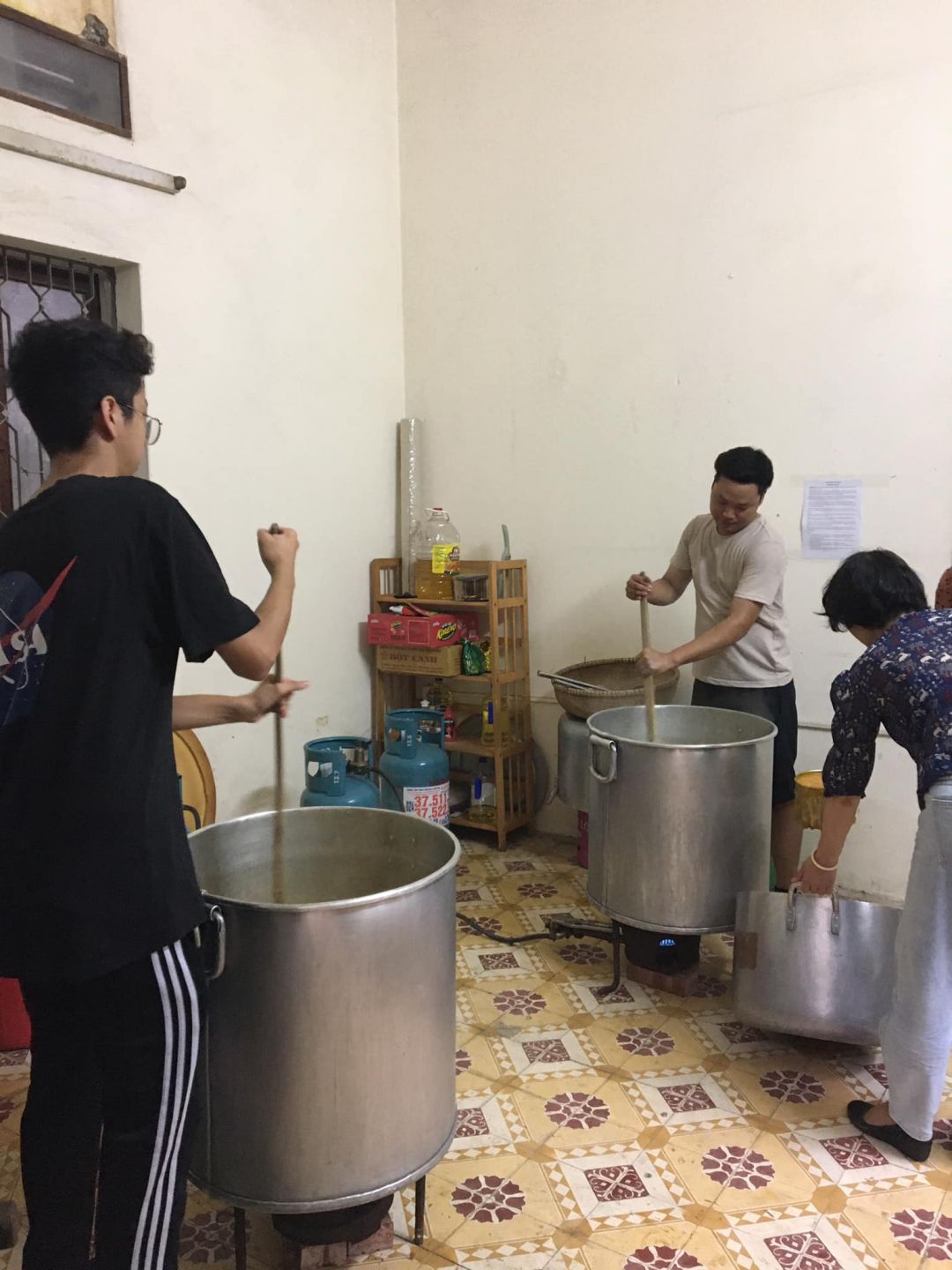 (Rửa lại 2 nồi to, 6 nồi nhỏ, muôi nấu, máy xay, rửa nhân rau. 1 bếp luộc nhân rau bí đỏ carrot, 1 bếp đặt nồi to đổ nước đầy 2/3 đun to lửa. Các công việc hoàn thành khoảng 12h)