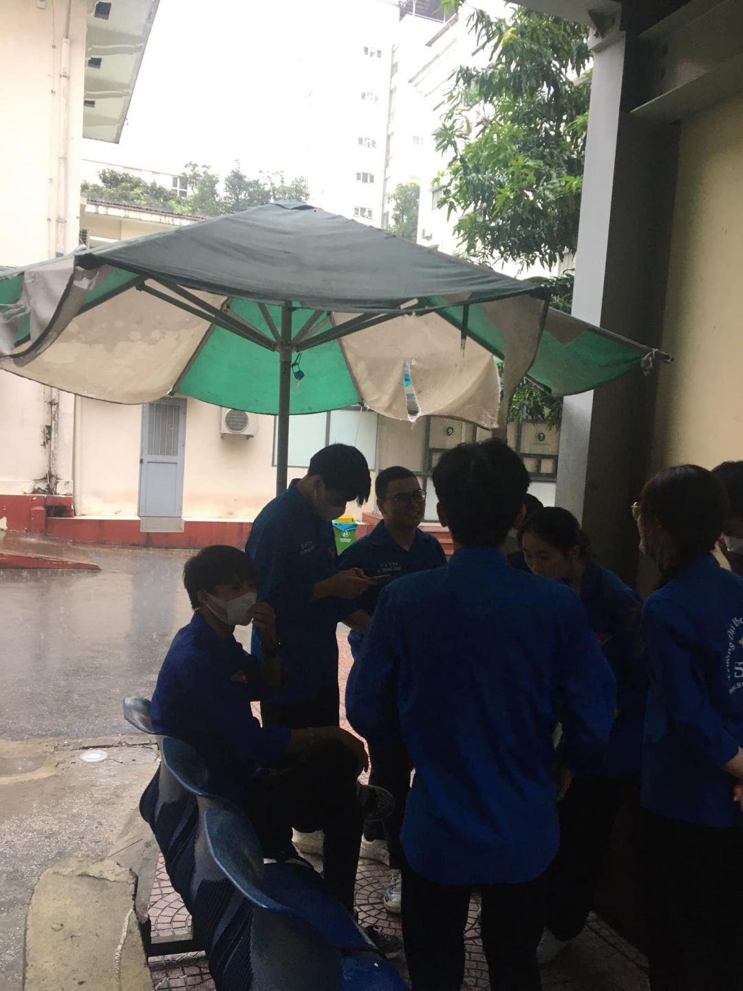 Do trời mưa nên cháo phát trong nhà E của bệnh viện. Cơn mưa rào không làm nguội được sức trẻ hừng hực đang chảy trong người các em sinh viên tình nguyện.