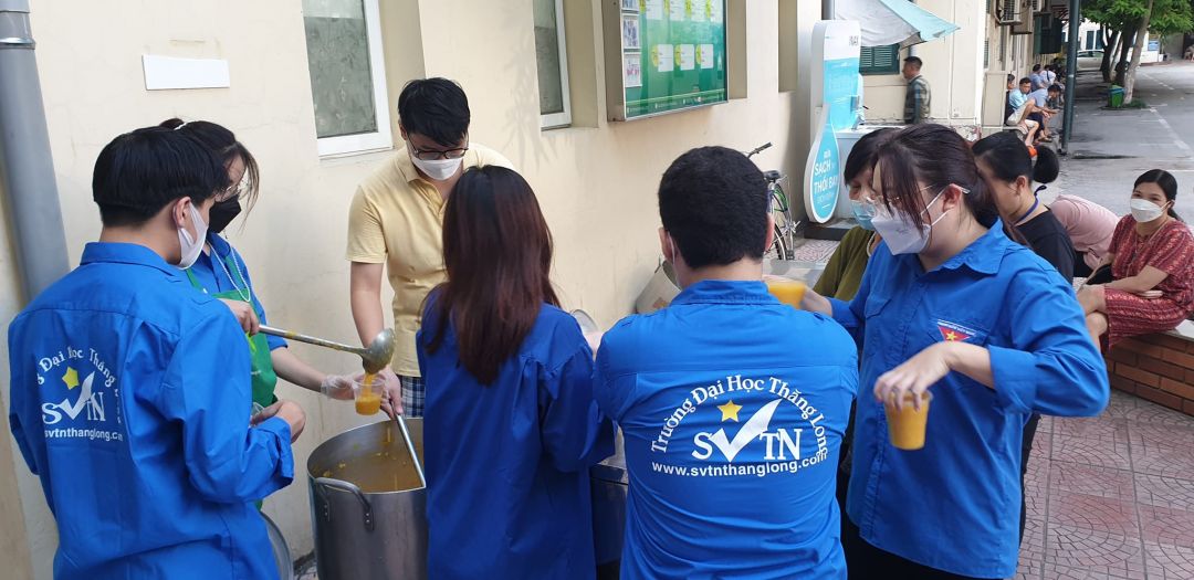 Bắt đầu phát cháo được một lúc thì hết veo 4 nồi, còn 1 nồi do hết cốc nên chậm xíu. Các bạn sinh viên tình nguyện trường Đại học Thăng Long hỗ trợ nhiệt tình nên cốc được mua bổ sung.